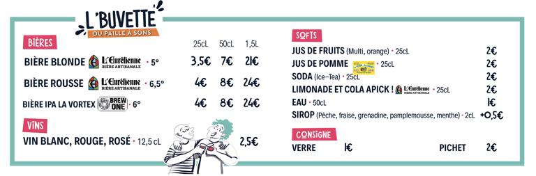 Une buvette sur place vous propose bières, vins, sodas, et autres boissons, le tout servi (avec amour) par l’équipe du festival.